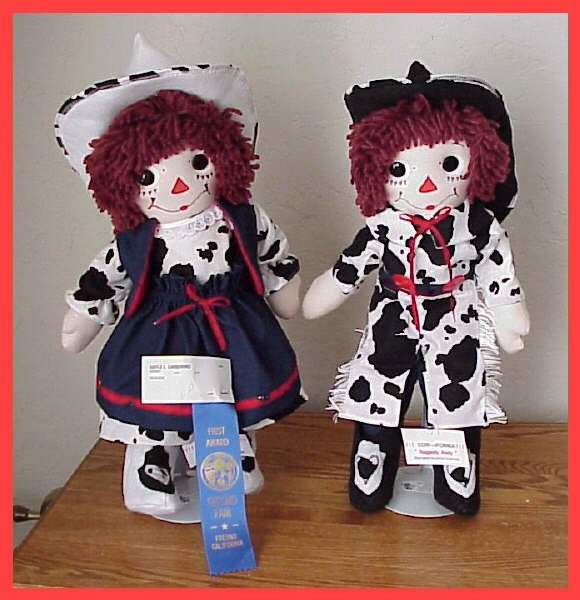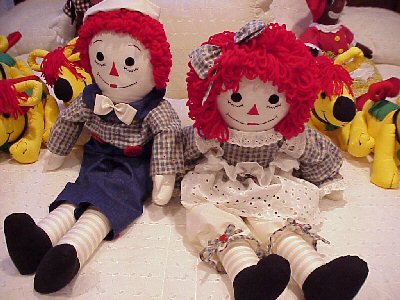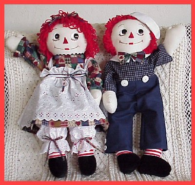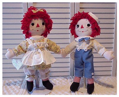 "READY TO SHIP" Raggedy Ann and Andy sets. Some have the embroidered facial features with hand-looped hair, others have painted facial features with wigs reminiscent of the various styles
