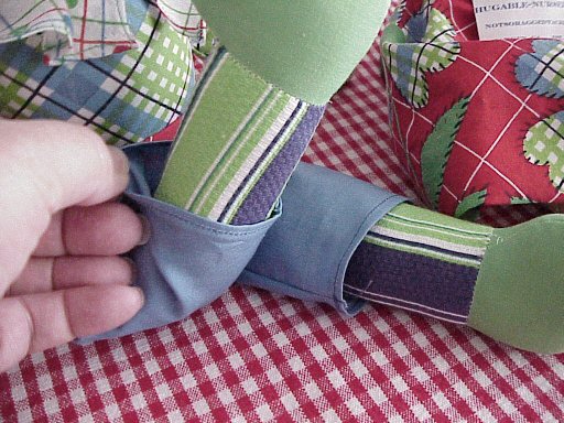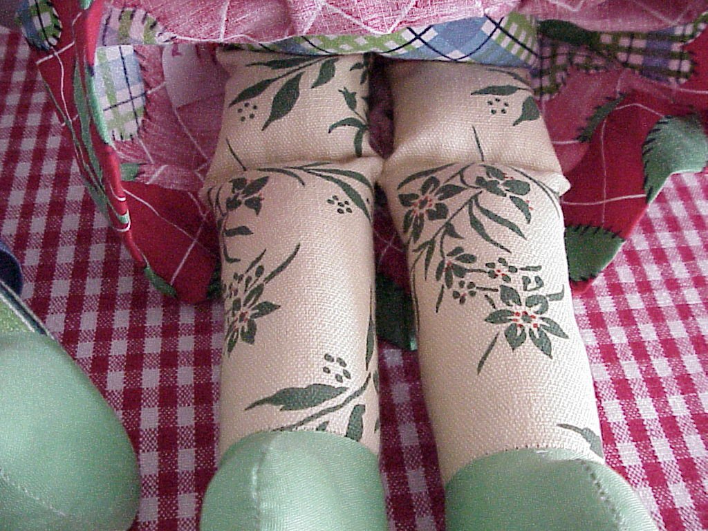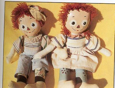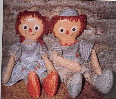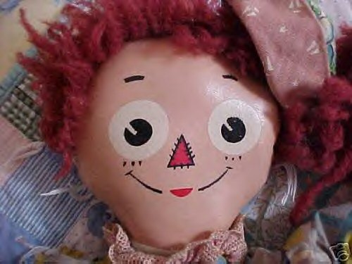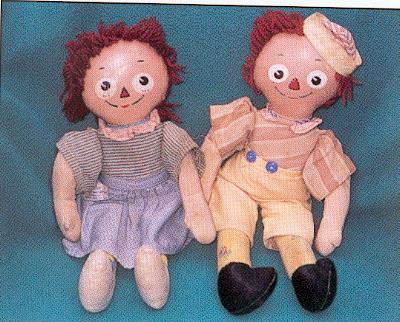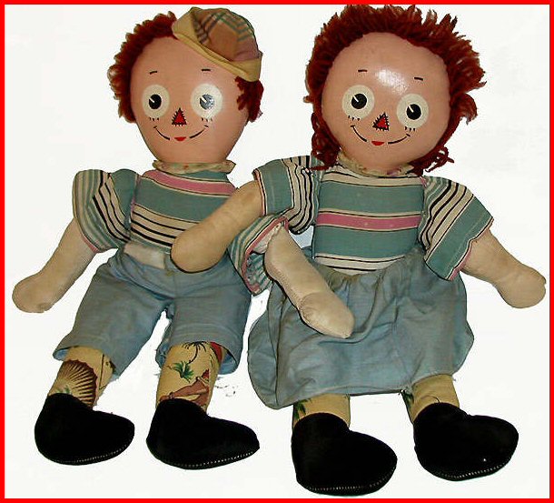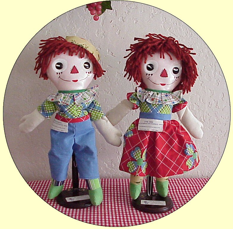 These dolls were made in the likeness of little "rag-a-muffins", from fabrics you might pull together from your "rag-bag". Their blouses and/or shirts consisted of the bodice being that of the torso of the doll with attached sleeves of matching fabric, sewn to the doll. Ann's skirt and Andy's pants were removeable.Unusual prints and stripes were mixed and matched including thier legs and feet. Their faces were made from "shiny" oil-cloth; and facial features were printed on. Usually large white circles for the eyes with smaller black "pupils", with the "pie-shaped" slice similar to Molly-'Es. The triangular nose was small with printed "stitches" out-lining it; small straight eyebrows; Hair made from various shades of reddish-brown.