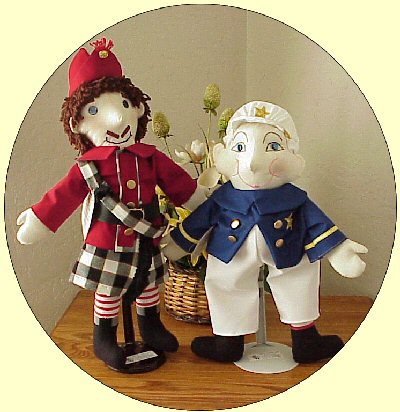 In May 1931 the Volland Company introduced ten Gruelle-inspired character dolls as part of a fourteen-item line, collectively referred to as the "Raggedy Dolls." Included were Raggedy Ann and Andy and Beloved Belindy; a newly designed Sunny Bunny, Eddie Elephant, and Little Brown Bear; and a first-time ever Uncle Clem, Percy(the)Policeman, Eddie Elf, and Pirate Cieftain. The characters appeared in Gruelle's My Very Own Fairy Stories, Wooden Willie, Raggedy Ann in the Deep Deep Woods, Raggedy Ann and Andy and The Camel with the Wrinkled Knees, and Marcella. Rounding out the line were four non-Gruelle dolls. Although Gruelle commissioned a doll for this character....... I had never personally seen one, until I visited the Raggedy Festival in 2004, though I have seen pictures in several of my "collectors" books since I created my own version. My doll is created from the Storybook pictures of the Uncle Clem character, rather than from the "original" doll. I did not realize there had been an "original" until after mine was created and I had sold several of them. I would be happy to create one in the likeness of the original if someone places a "Special Order".