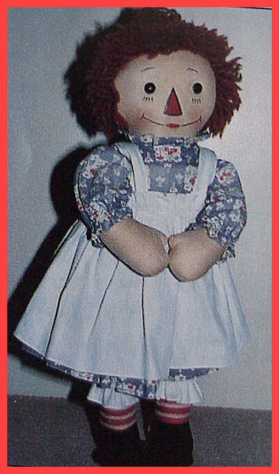 First came the Black Outlined Nose Raggedy Ann & Andy dolls. Georgene produced these dolls from 1938 to the early 1940's. The dolls came in a variety of sizes (19", 23", 31"). Their rather long red noses were out-lined in black and their wigs were made of wool yarn. Their outfits closed only with a small gold safety pin. Andys pants and Anns apron had metal buttons . Both Ann and Andy looked identical, with black shoe-button eyes, and their bodies were stuffed through a seam up the back.