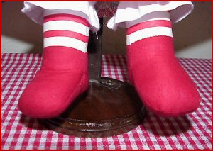 Feet" Belindy was introduced. She was 15" with front-facing boxy feet, with a medium brown cloth body; UN-out-lined nose: red blouse, shoes, and bandana; shirt-button eyes; She had two snaps on the front of her blouse; she had no company markings, but because of her well-documented and unusual boxy feet, she is readily recognized as Georgene's Belindy.