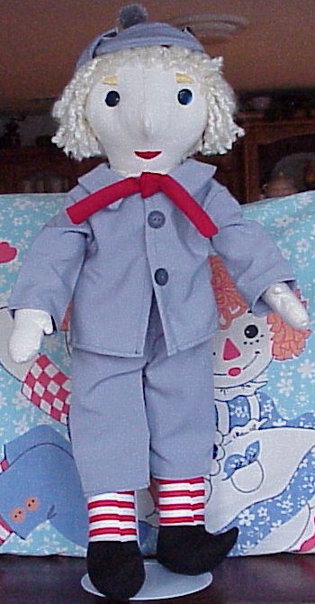 His facial features are hand-embroidered, and his blonde hair is in a "Dutch-cut" and sewn on manually loop-by-loop. He has the traditional red/white striped "Raggedy" legs.