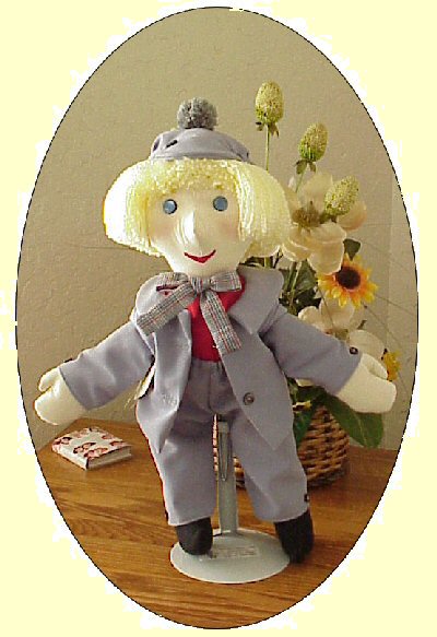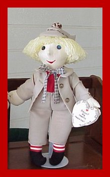 He comes dressed in an adorable little suit, with matching Dutch Hunter's cap and trousers(your choice of beige or grey-blue); His fully-lined jacket is trimmed with tourtouise-shell buttons and two button holes; and stands open to reveal his little red shirt and his bow tie of a contrasting print. His black velour "Dutch-style" shoes complete the ensemble. He is made of muslin with stuffed little ears and nose, and beautiful blue button eyes!