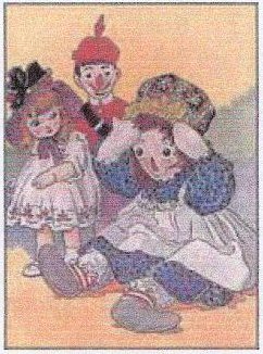 And there was one picture of a very pretty little girl with long curls tied tightly back from her forehead and wearing a long dress and queer pantaloons which reached to her shoe-tops. And then out of the heap she pulled an old rag doll with only one shoe-button eye and a painted nose and a smiling mouth.