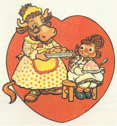 In the story, the dolls visit Maizie Moo Cow and bring along their friend, Betty, who just happens to play the piano. Everyone enjoys a feast of hot dogs, cookies, loolipops, and of course,Lots of Ice Cream!!. More visitors stopped by to join in the merriment! There was Catherine Calf, Bertha Bovine, Henrietta Holstein, Jenevieve Jersey, and Madeline Muley.