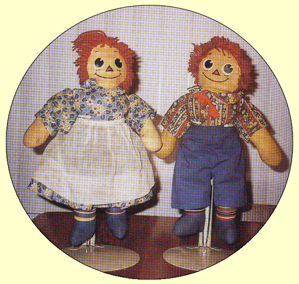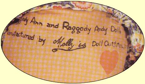 chest. Volland's Ann first had a candy and later a wooden heart, which could be felt beneath the cloth. But Andy was never given one. Molly-'Es Raggedies are easily recognized by their distinctive look. Ann & Andy have identical bodies including Ann's top-knotted-straight back Auburn wool wig. Only their clothing