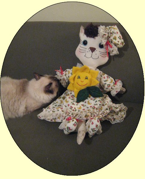 Crystal emailed pictures of her two kittens and I began work on creating cloth doll "ragdolls" in their honor. After my second attempt.............this is how they turned out.....I also made Sunny (a.k.a. Sunflower) a little sunflower toy and "Moonie" (a.k.a. Moonbeam)a little moon toy.....matching those found in the print of the fabric Crystal chose for her cloth kittens. She also mentioned that her "Real-for-Sure" kittens sleep all day and want to play with her all night. So she requested that the cloth kittens be made as Awake/Asleep Ragdoll Cats.