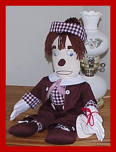 and brown shoes with big white fabric buckles. His brown trousers are accented with two large white buttons (on his fat little tummy), and small white buttons on each "cuffed" leg. A mauve colored "tie" adds the final touch! He is a real charmer and is fast becoming a very sought after character doll ! He is made of quality muslin, his facial features are hand-embroidered, and his brown yarn hair is hand-stitched piece by piece. He has side-facing legs with the traditional red/white stripes and brown/white checked socks.