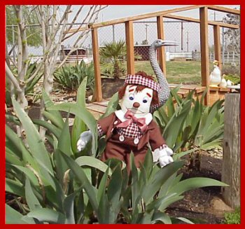 He comes dressed in an adorable little brown suit, has large white gloved hands;a brown fabric stuffed nose;and large blue embroidered eyes, with heavy dark brown yarn eyebrows. His hair is brown yarn, topped with a cute little brown hat with brown/white checked brim and a little brown yarn ball on top; His short brown jacket with "pointed" lapel, covers his checked, long sleeved shirt with white peter pan collar. He has matching checked socks,
