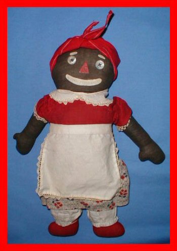 The P.F. Volland Company's first Beloved Belindy doll was 15" tall. She had hand-painted or silk-screened face; Her eyes were four-hole pearl buttons stitched with black thread "X"; solid red shoes & bandana, with side facing feet. Her dress had a solid red top, which closed with a tiny gold safety pin in the back, the skirt was made in a variety of floral fabric. She wore straight white pantaloons and an oblong shaped apron. Her white collar, sleeves and apron were trimmed with matching lace trim. She was produced from 1926-1933.